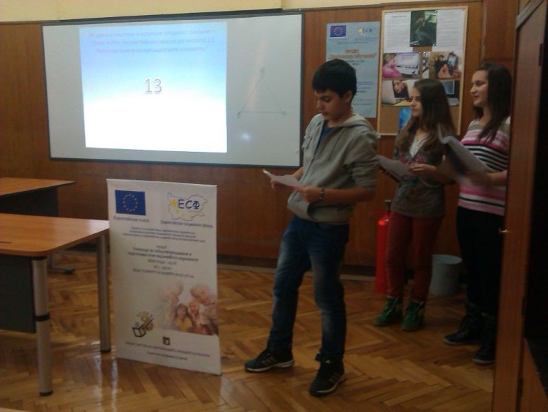 На 16.01.2014 год. в един от мултимедийните кабинети на училището се проведе първата представителна изява на клуб „ Полезна и забавна математика”, с ръководител Йорданка Неделчева.Гостите с интерес научиха интересни суеверия за числа и геометрични фигури, наблюдаваха математически фокуси.Всички се забавляваха с веселите истории и анекдоти, посветени на математиката. Особено интересни се оказаха задачите, включени във викторината.