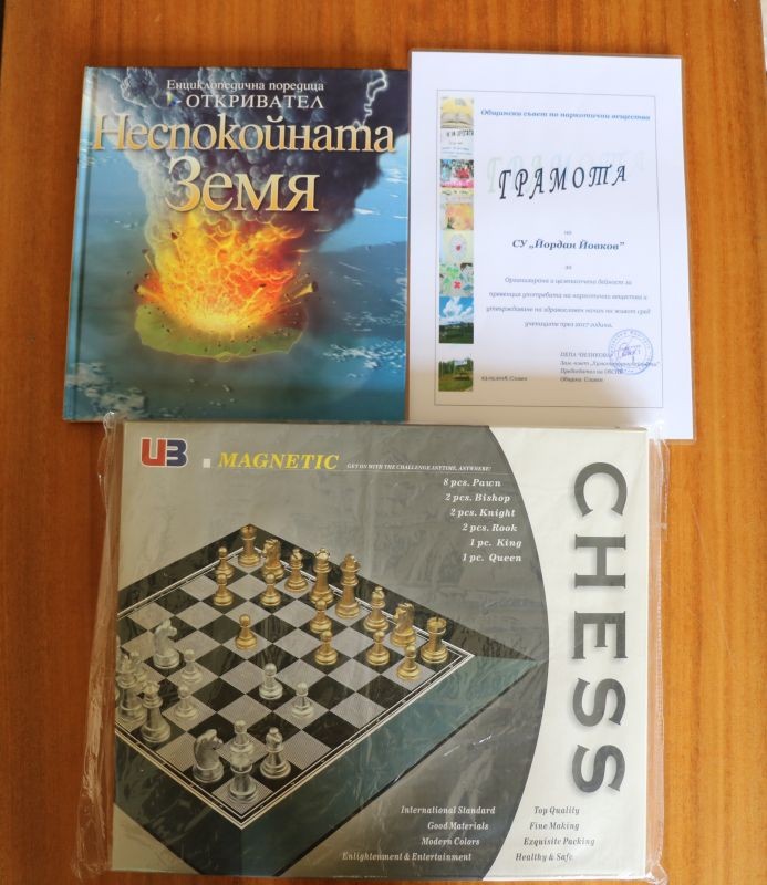 Общинският съвет по наркотични вещества връчи грамота на СУ "Йордан Йовков" - Сливен за организирана и целенасочена дейност за превенция употребата на наркотични вещества и утвърждаване на здравословен начин на живот сред учениците през 2017 година.
