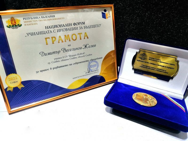 На официалната церемония бяха отличени иновативни учители от цялата страна. Сред тях бе и инж. Димитър Желев - учител по информатика и информационни технологии в СУ "Йордан Йовков" - Сливен. Той бе отличен за принос в развитието на съвременното образование с плакет и грамота, връчени от г-жа Мария Гайдарова - заместник-министър на образованието и науката.