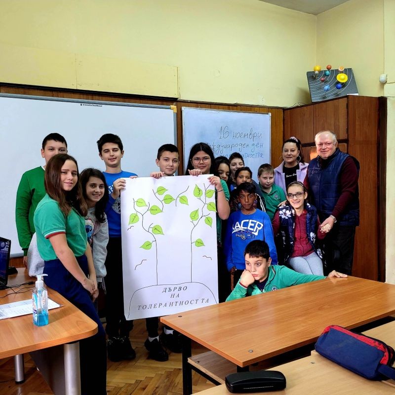 Учениците от 5.“б“ клас заедно с училищния психолог Марин Пандохов, ресурсен учител Мария Вълева и класен ръководител Марияна Аврамова, направиха своето „Дърво на толерантността“. Чрез него те изразиха основните принципи на разбирането за толерантност: приятелство, уважение, откритост, добродушие, търпение и др.