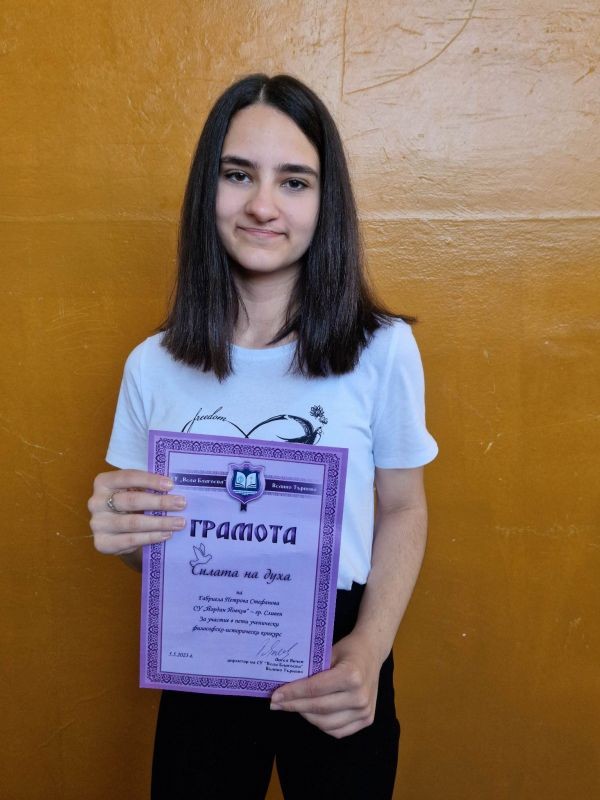 Габриела Стефанова от 8.а клас от СУ „Йордан Йовков“ – Сливен взе участие в петия ученически философско-исторически конкурс „Силата на духа“, организиран от СУ „Вела Благоева“ – Велико Търново. Осмокласничката написа есе по темата и бе удостоена с грамота за участие.