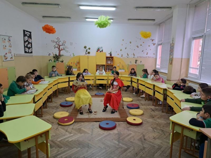 Петокласничките Ева Гуиди и Божидара Голова, преобразени като Снежанка и Червената шапчица, посетиха г-жа Чотова и първокласниците и ги взеха на пътешествие чрез магията на разказаните истории.