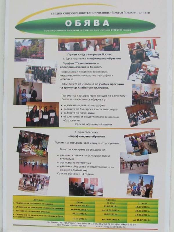 СОУ „Й. Йовков” взе участие с богато украсен рекламен щанд. Две презентации, изработени от г-жа Ст. Попова и г-н Б. Капсъзов, показани на лаптоп с безжичен Интернет, запознаваха посетителите с живота в училището. Екип от ученици и учители посрещаха всеки гост с цветни рекламни плакати и брошури. В тях бе представен Приема след осми клас за 2012/ 2013 г. :