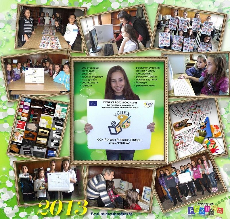 Студио „Реклама” по проект УСПЕХ проведе първата си представителна изява на 8 февруари. Под ръководството на г-жа Стефка Попова и г-н Бурхан Капсъзов, участниците (от 5 а и 7 а клас) навлизат в тайните на цифровите изображения. Посредством компютърни програми опознават основните формати на съвременните медии. Формират и надграждат умения за работа с текст и мултимедийни продукти. Разпределят, селектират, маскират и заменят откъси от изображението. Учат се да работят в екип.